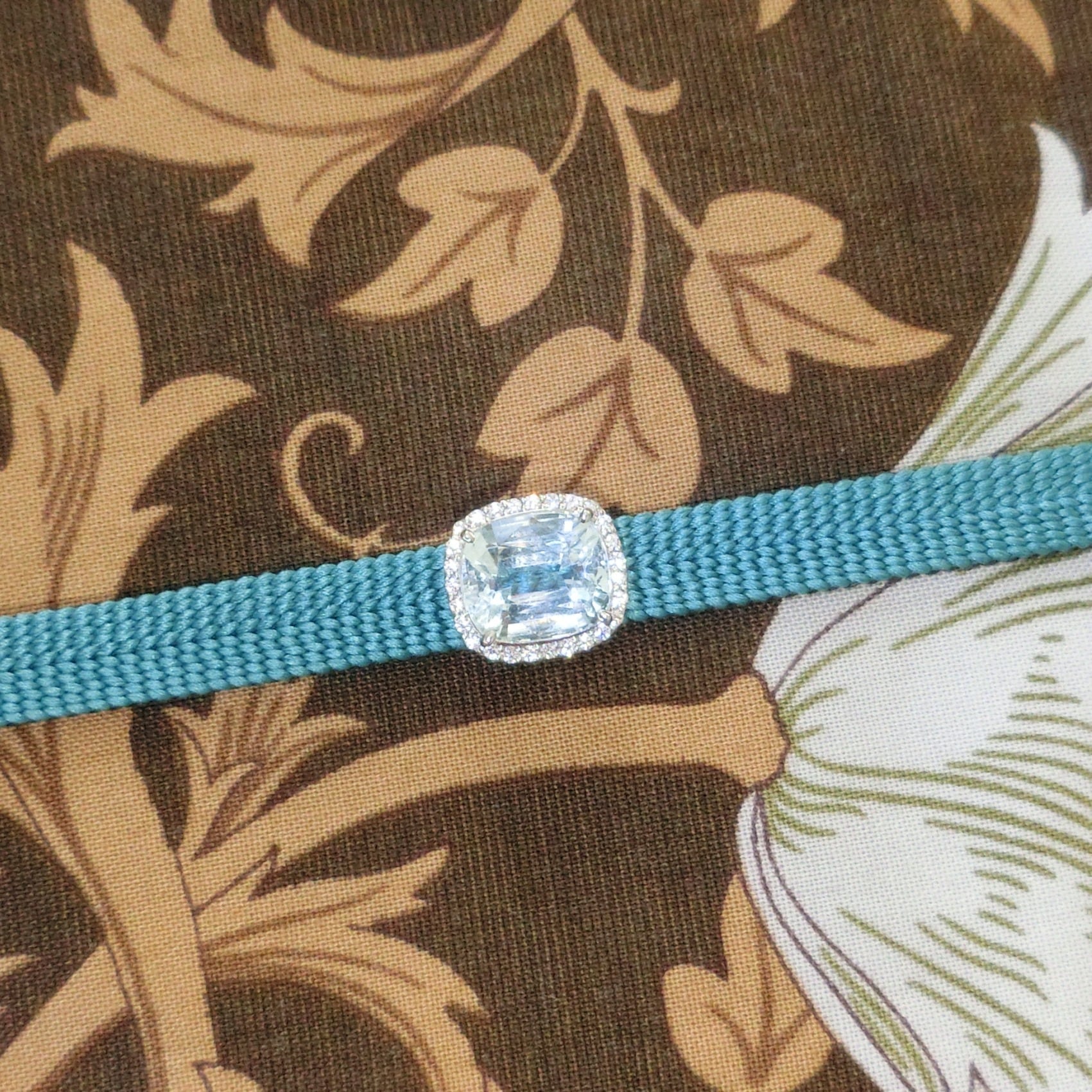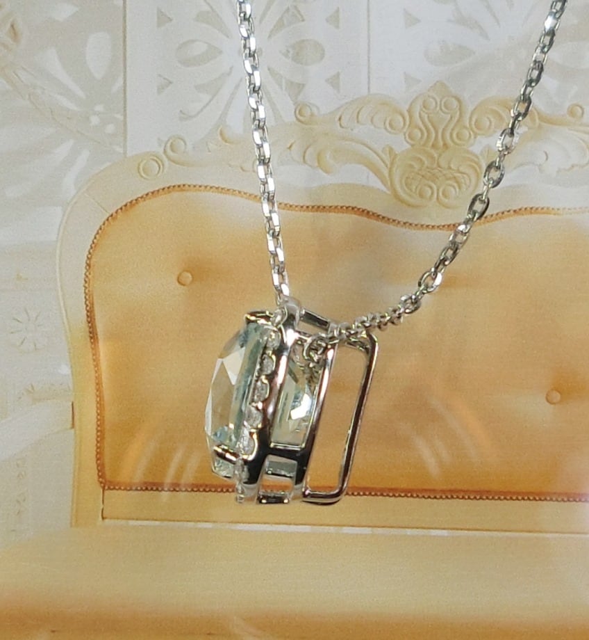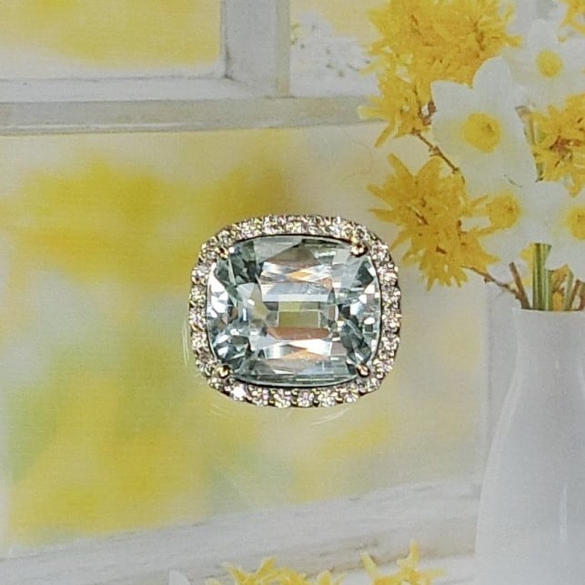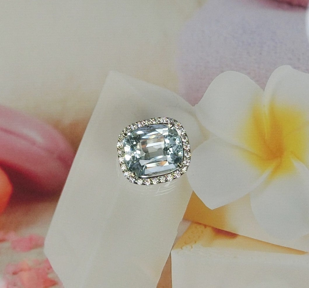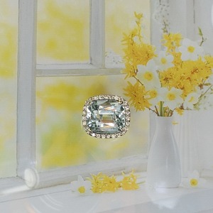角を落とした、やわらかな大粒クッションカットにメレダイヤですので、デザイン的には、媚びないきらめく透明感。柔らかなあさはなだ色は、ほぼどんなお色の帯締めにも合いますので、ふだんぎの着物にも、洋装にもちょっと格上の輝きをまとって頂けます。