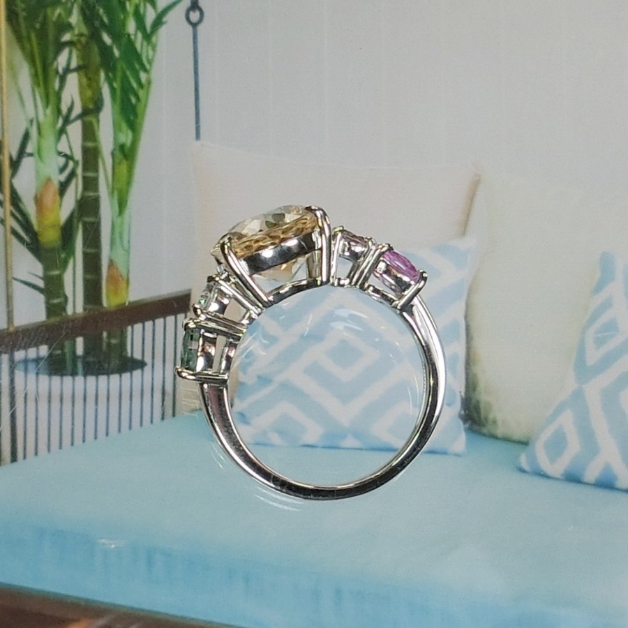 過去の製作例で:シャンパンゴールドカラー、ピンクダイヤ+非加熱ピンクサファイア+アレキの指輪に。